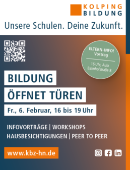 „Bildung öffnet Türen“ am Freitag, 6. Februar 2026 von 16 bis 19 Uhr an den Standorten der Kolping Bildung. Mehr unter www.kbz-hn.de